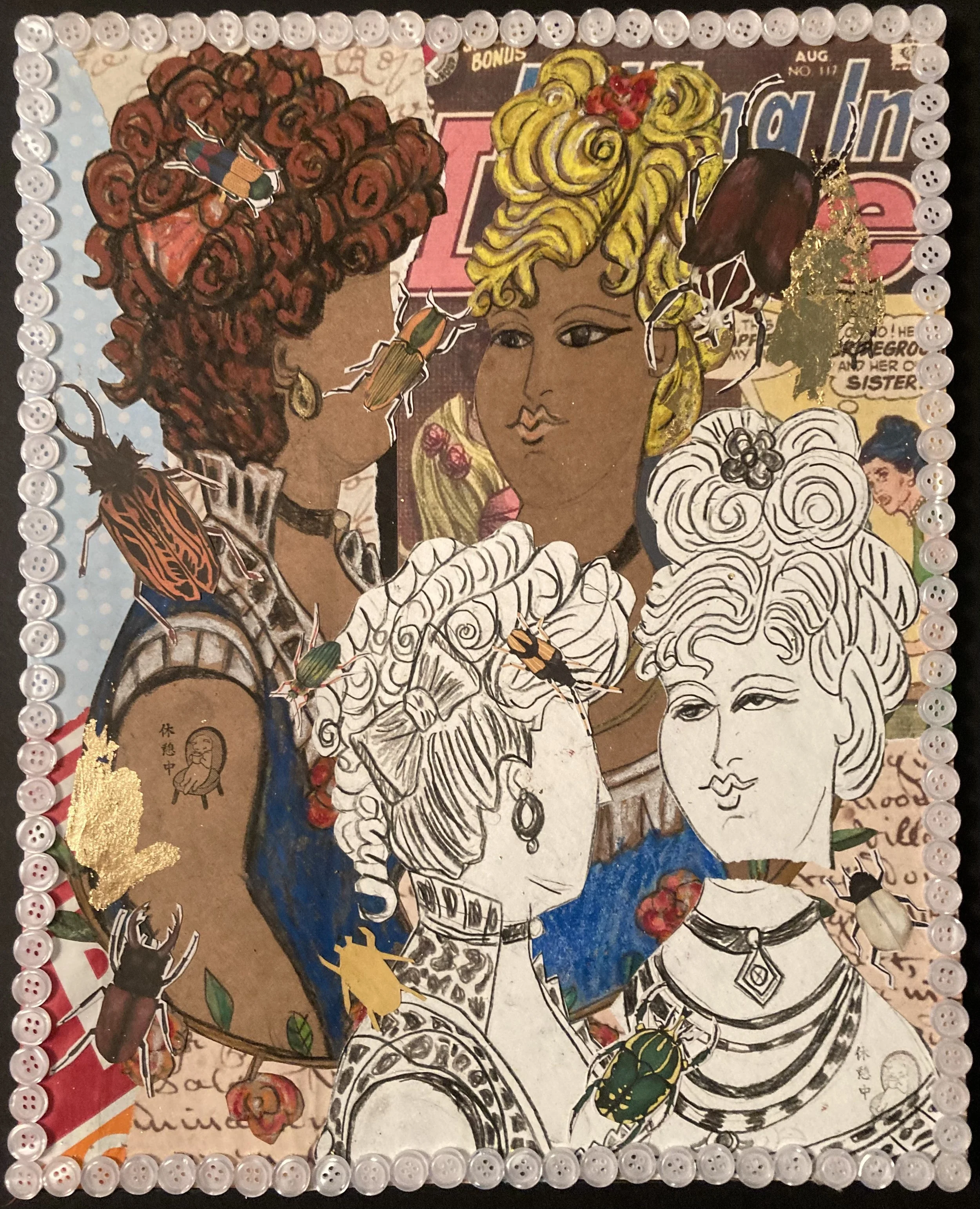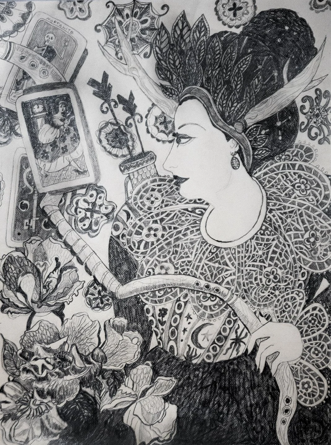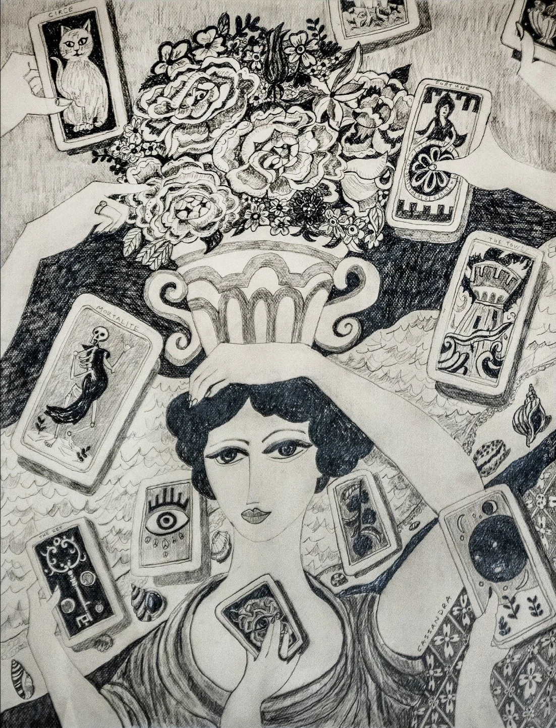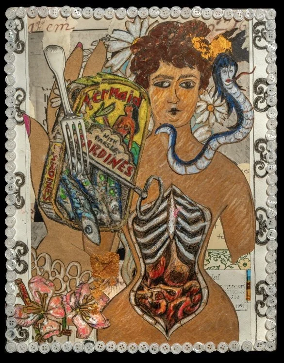 "Witches, Goddesses, Corsets, and Bustles" is a collection of portraits created with graphite on paper and canvases made with oil pastels, ephemera and collage. Each piece delves into the complex and compelling narratives of witchcraft, divinity, femininity, and the historical symbolism of corsets and bustles. Her hand built ceramics add a tactile and sculptural element to complement the work.
