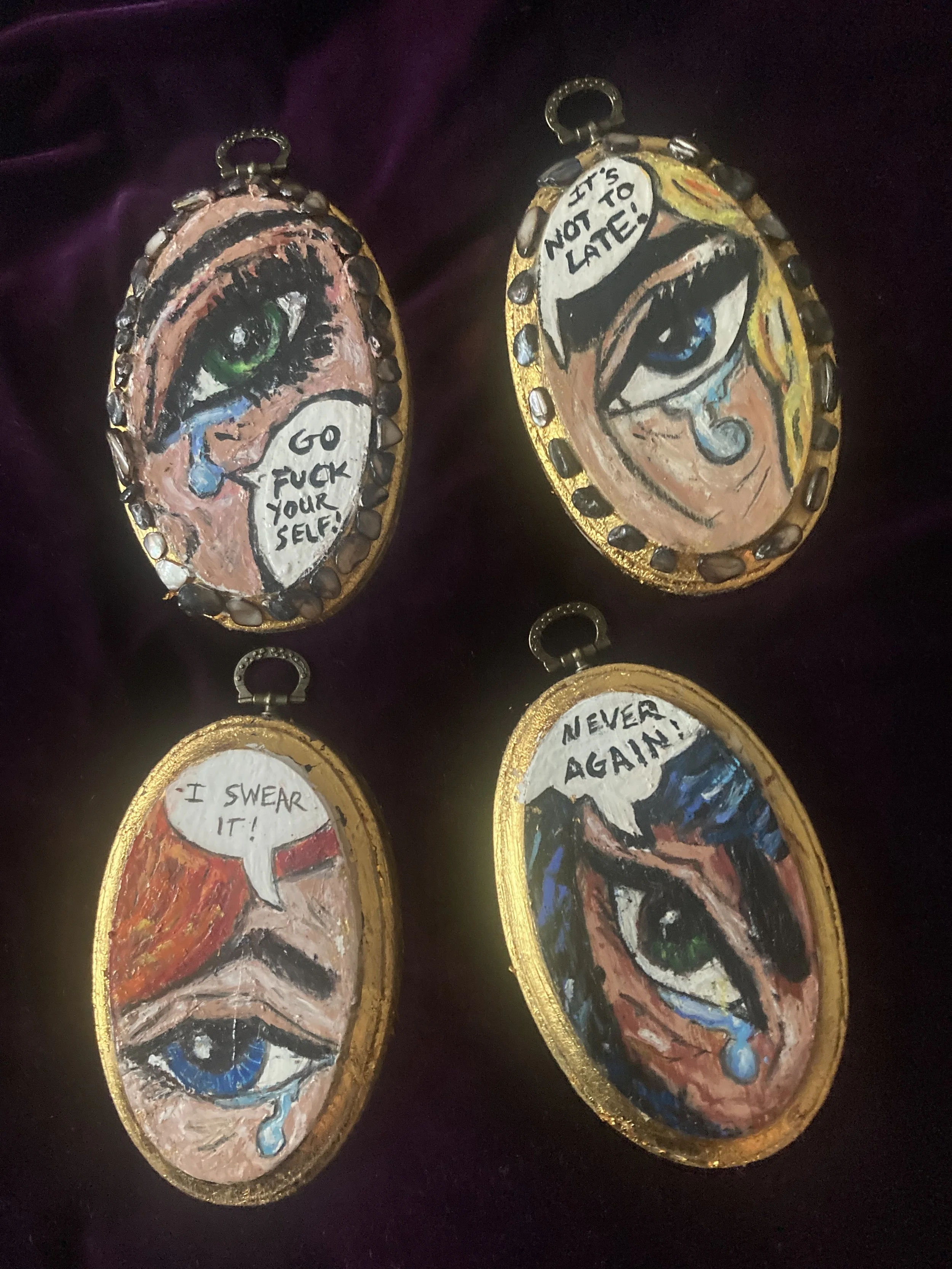 “Lovers Eye Paintings” acrylic, oil pastels and gold leaf on wood, 5 x 3”