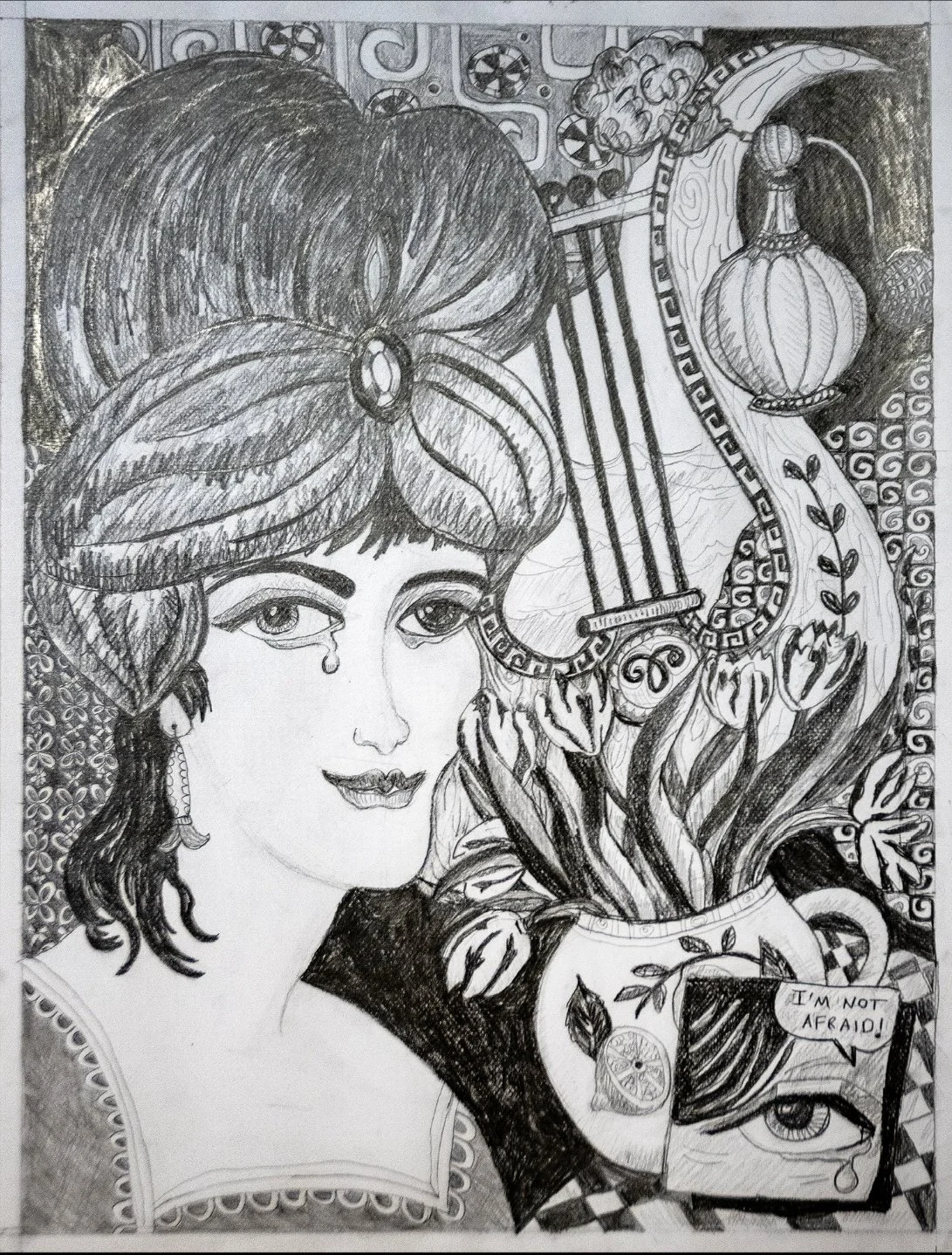 “Cassandra” (graphite on paper, 20” x 26”, 2024)
