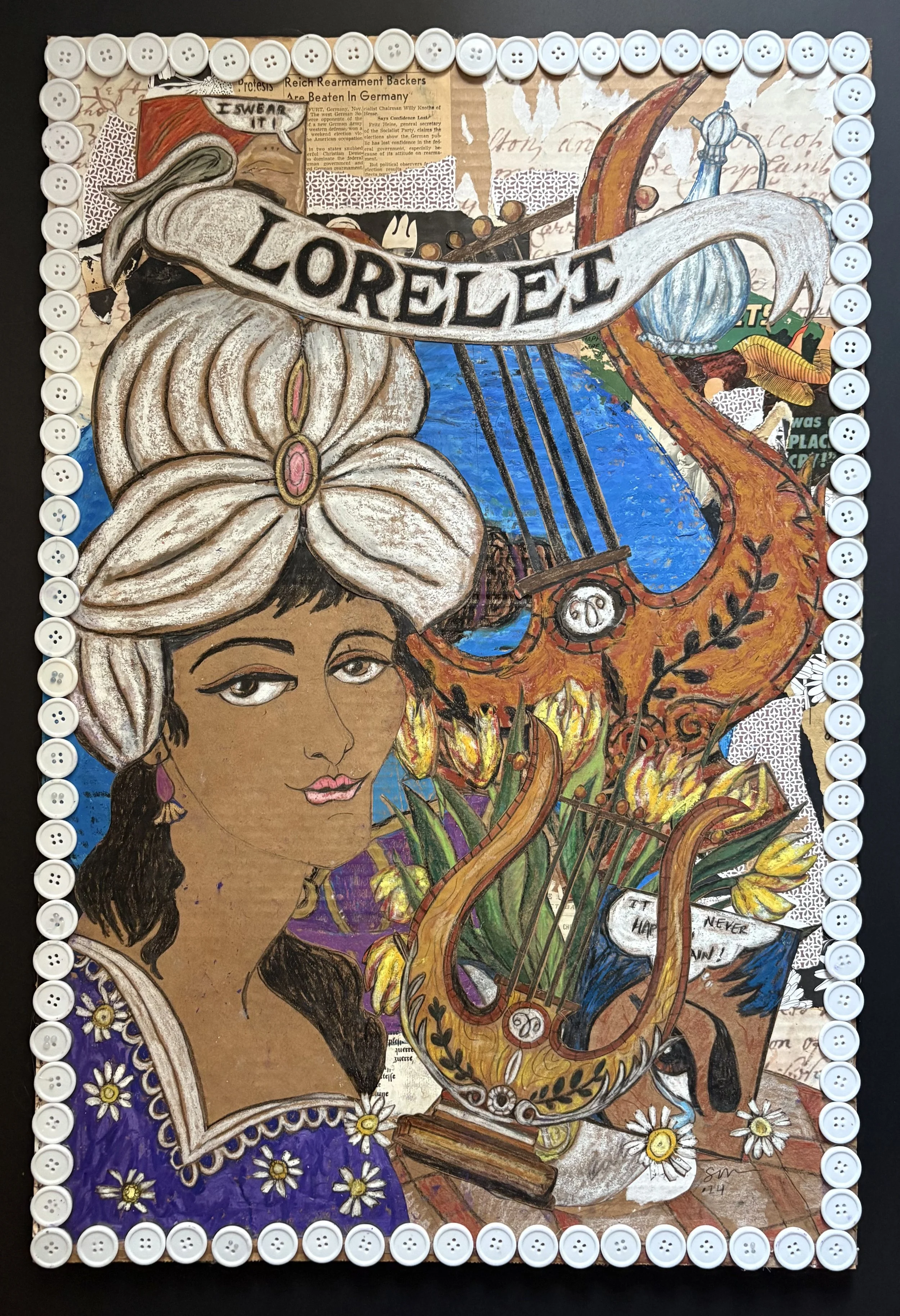 “Lorelei ” (mixed media and oil pastels on board, 20” x 30”, 2024)